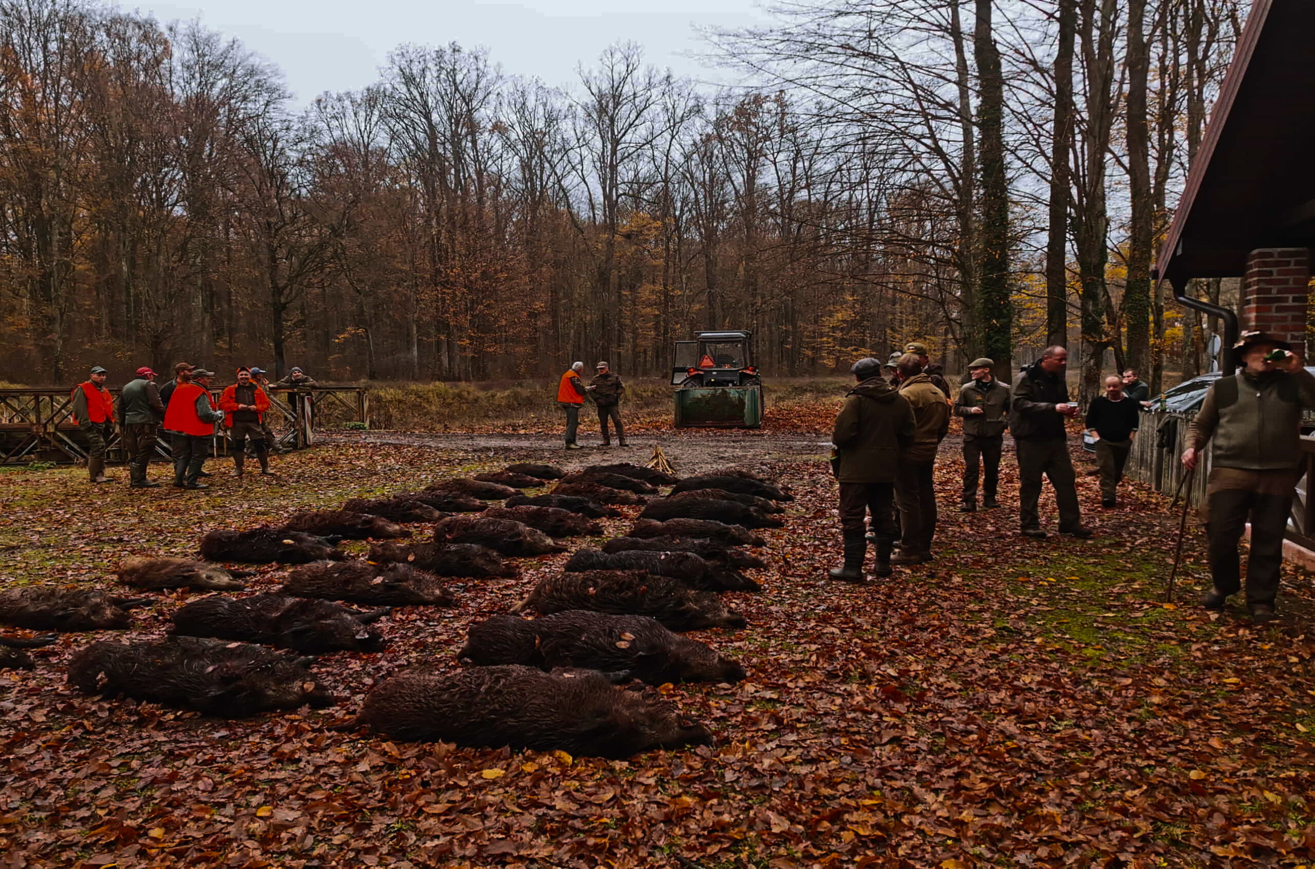 - Pogon od nekolicine ljudi bez pasa tihim kretanjem kroz pripremljeno područje nastoji pokrenuti svinje u pravcu mjestu dočeka lovaca koja su postavljeni na tlu i prelazima divljači.